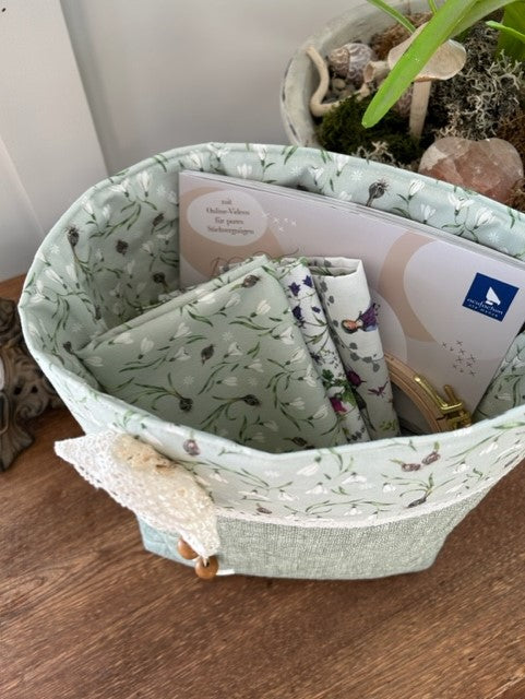 Hello friends! As you may know from my Instagram post, the lovely Laurie, who works at the studio, made a wonderful tote from just 2 fat quarters of Acufactum fabric. It is made with the beautiful Snowdrops fabric which you received if you're in our Acufactum Fabric Collector's Club, and Emma fabric in the colour Thyme, though of course, any fabrics would work! Laurie has kindly written up a pattern for you all, in case you'd like to make this quick and easy tote too! When we are able to, we will add more step by step photos of the construction, but wanted to get something up for you quickly for those who'd like to try making a tote right away!