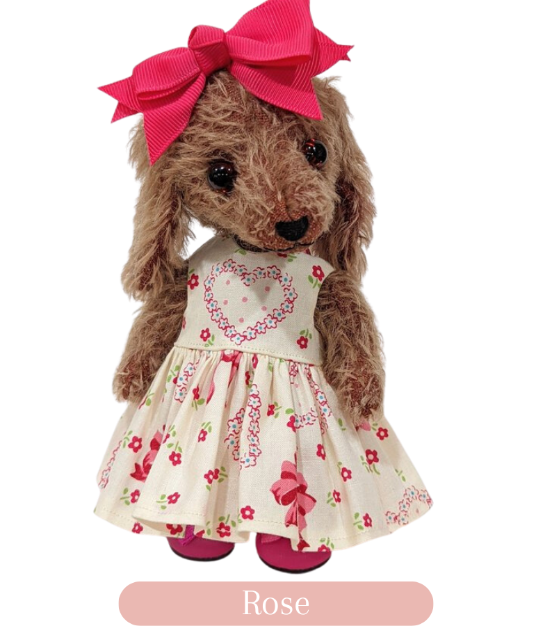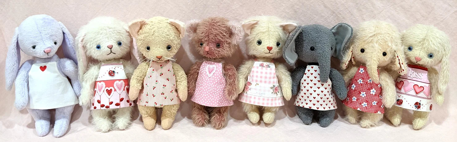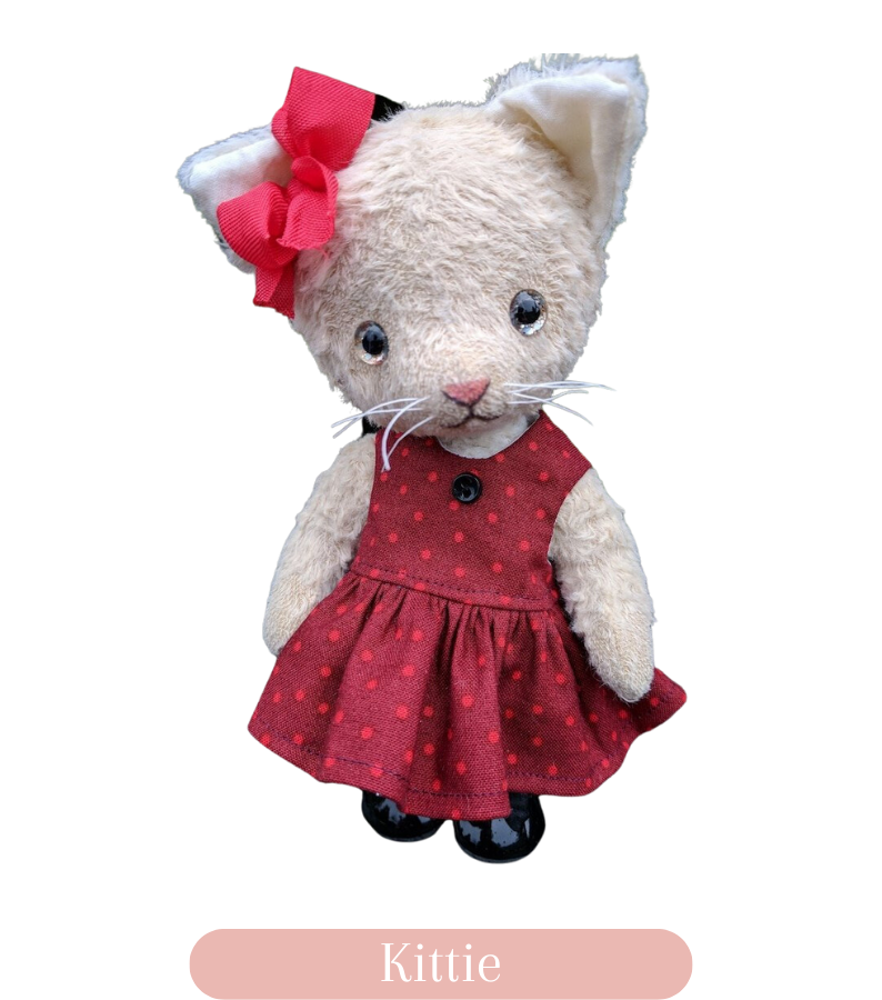 Jean- My first bears were a wider size range and had a more traditional or antique style/proportion. For my second line of teddy dolly patterns, I wanted to design a smaller line of animal friends, still traditionally jointed but smaller but easier to sew using the block method and no gussets! I really enjoy making the new designs because they use small amounts of fabric, take less time, and are easier to make with simple sewing methods for the dolls and clothing designs. Making them is like playing dolls again because these ones are balanced and made to stand and pose!