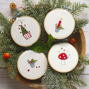 The Christmas Minis embroidery file combines four small motifs that delight with fine details and winter warmth. A festive holly and berry branch in a thimble, a glowing candle, a small Christmas tree and a cheerful mushroom with colorful pins bring Christmas joy to any sewing project. The lovingly designed miniatures invite you to create and combine them and give handicrafts a charming, festive character.
