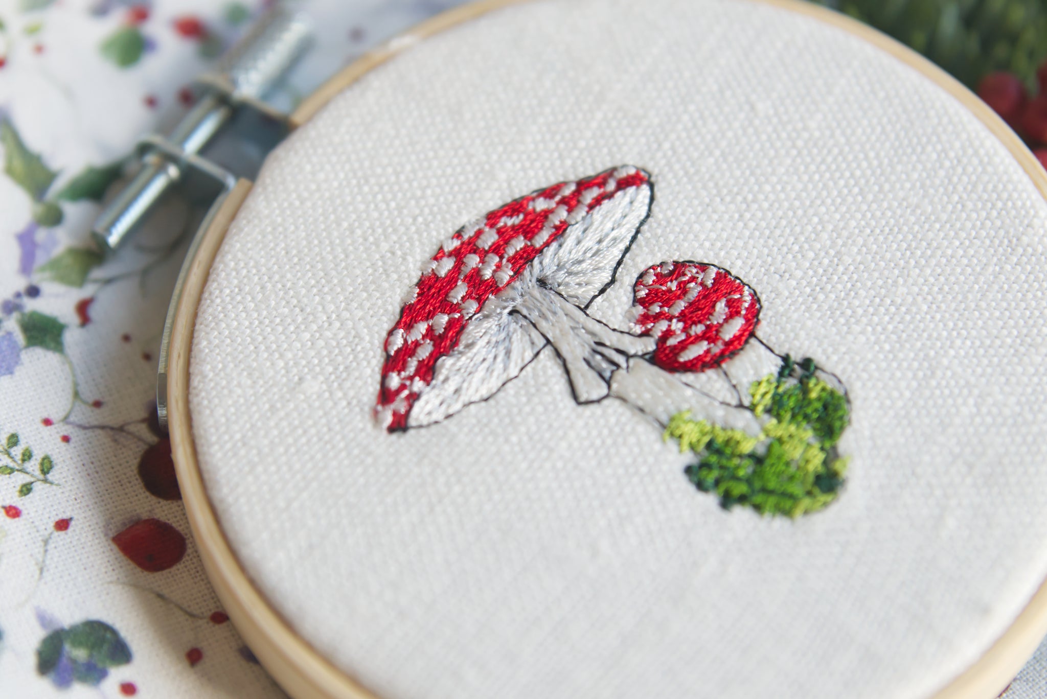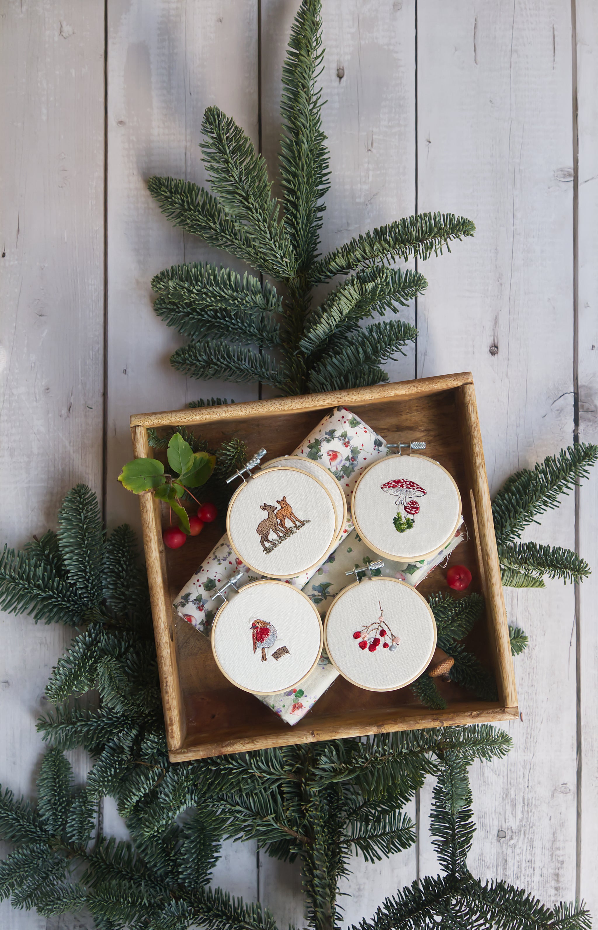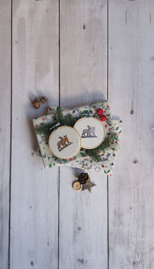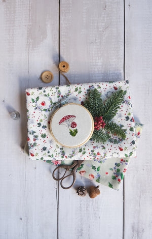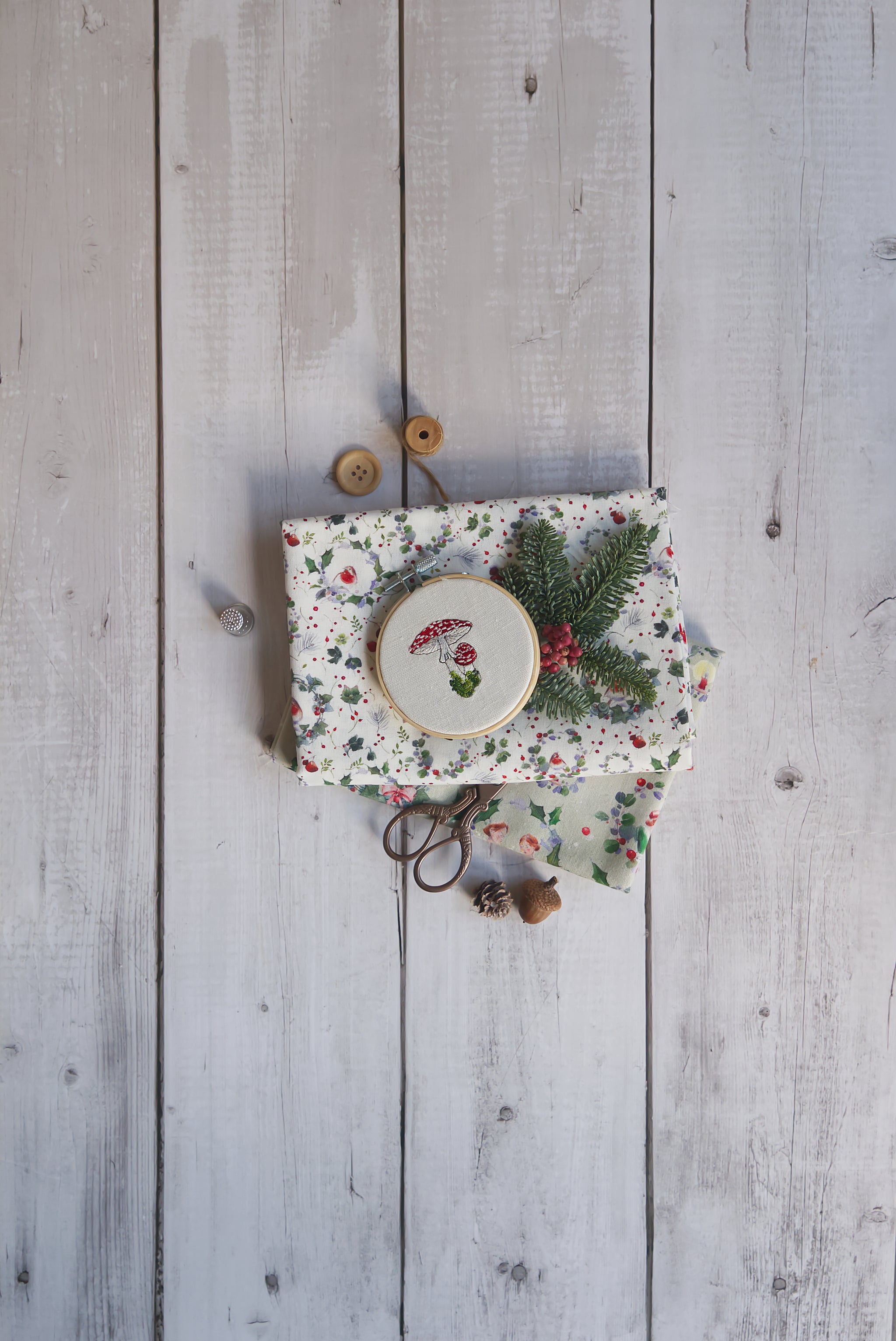 A little robin, deer in winter grass, a fly agaric mushroom, and a delicate berry branch tell the story of the quiet beauty of the cold season in four delicate embroidery designs. Each motif is lovingly crafted, bringing a touch of nature's poetry to fabric.