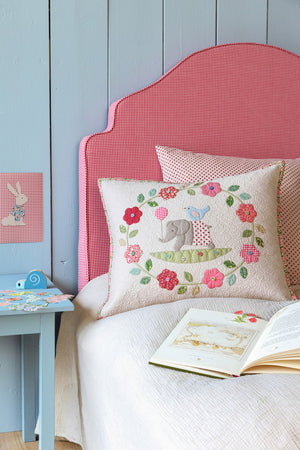 Tilda Basics collections are designed to be great companions to our other collections and a new Tilda concept is Vintage Nursery, which uses Poppyseed and Brie Basics with fabrics from the Creating Memories range for a collection of charming pillow designs. The mix of fabrics gives a scrappy, vintage look that is very attractive. The pillow designs use appliqué for flower and animal motifs and if you enjoy creating your own projects, the rabbits, dogs, cats and elephants can be interchanged for different looks. A page of appliqué designs is included showing these animals. There is also an appliqué alphabet, which allows you to add a letter of your choice to your design to suit the recipient. This Flower Wreath pillow will delight everyone with its appliqué wreath design encircling an adorable elephant and bird (or hare and bird). A scattering of buttons adds to the attractive look.