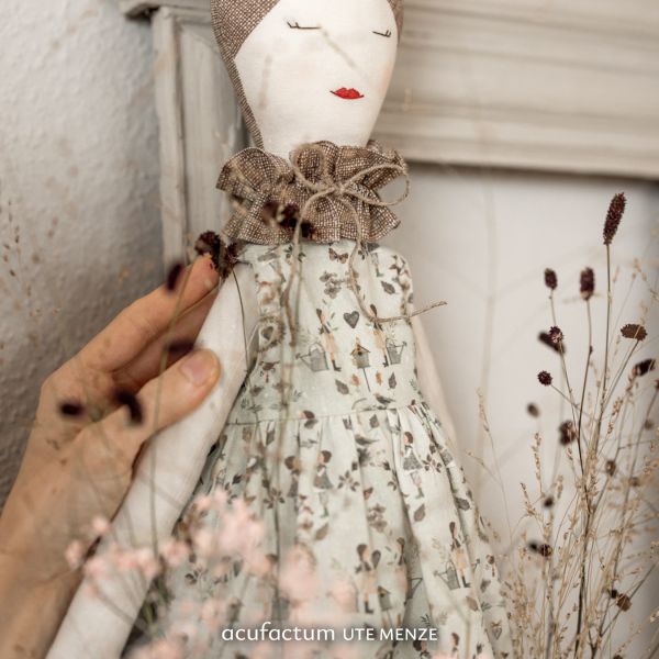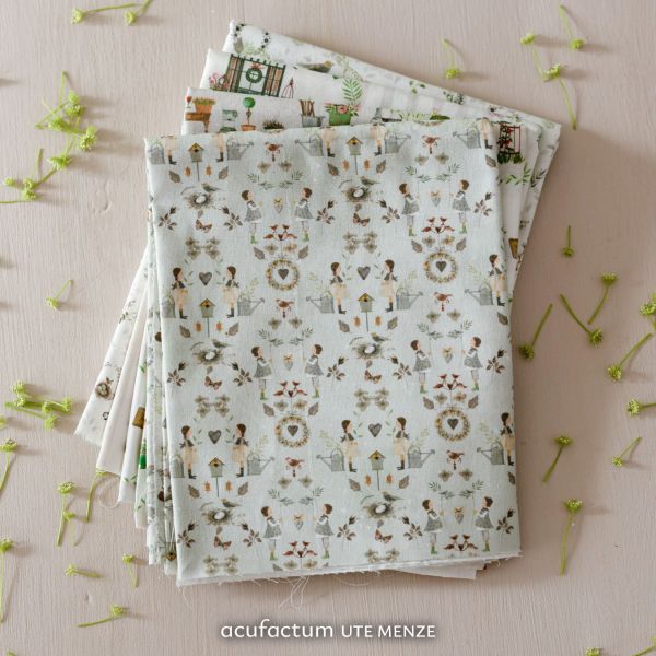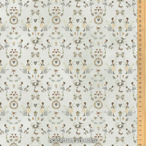 The cotton fabric " Garden Conversations" tells of quiet, delicate moments in the garden, captured in the fine, hand-drawn motifs by Kerstin Heß. On a soft gray background, little girls holding blossoms meet each other with friendly openness.