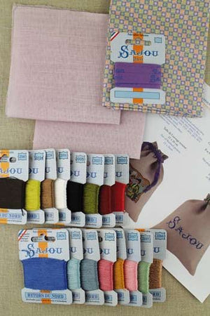 With this cross stitch kit, you can make an adorable drawstring bag embroidered on one side with one of our favourite motifs, Sewing Club, and on the other side, our Sajou logo. It is lined with our sky blue fabric featuring tiny pink and green motifs and closes with our Sajou logo ribbon in violet.