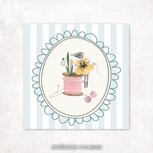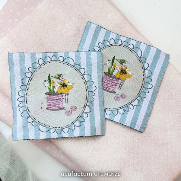 The patch shows a small spring elf that sits on a roll of yarn and lets its fine thread wander through the first delicate flowers of the year. Snowdrops, tulips and small buds awaken around them and give the scene a cheerful lightness.