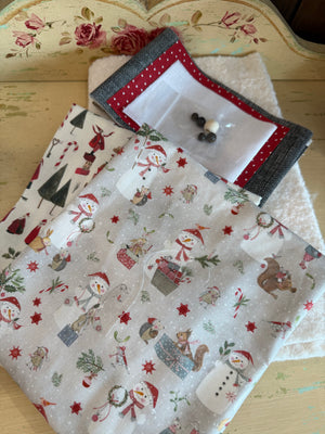*This kit includes the fabric to make one snowman and one Santa bag (Snowmen and Winter Animals and Santa Clauses are the main prints), beads for the eyes and Santa's nose, SF101, boucle and pattern needed to make this project. Embroidery floss is not included (used for the Snowman's mouth) nor is jute cord and a small piece of quilt batting or fusible fleece.