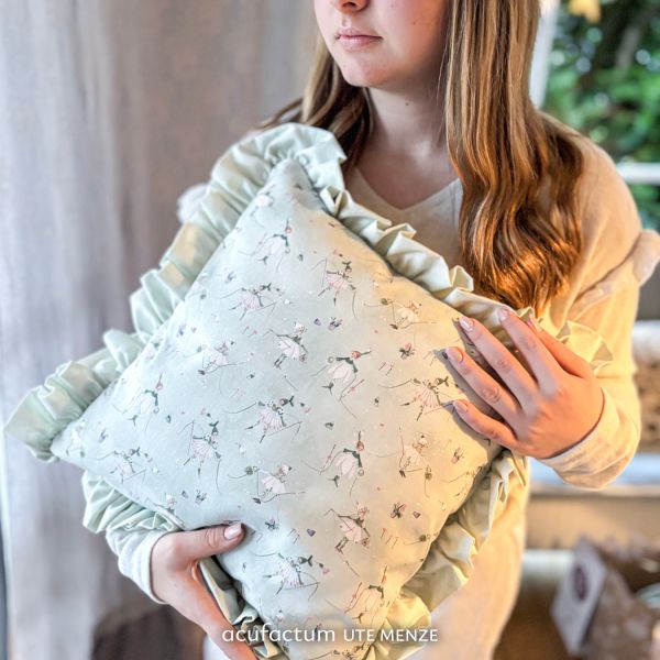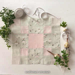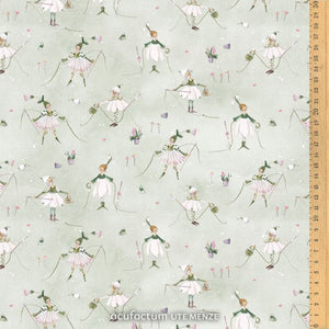 This soft green cotton fabric unfolds a quiet touch of spring and takes you into a world full of fine details. On the gently watercolor background, little flower elves dance with graceful flower dresses, each accompanied by needle and thread, as if they were sewing the spring themselves a little together.
