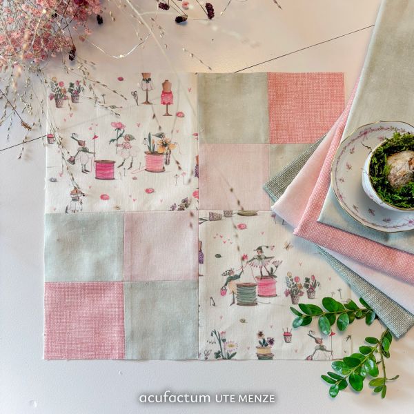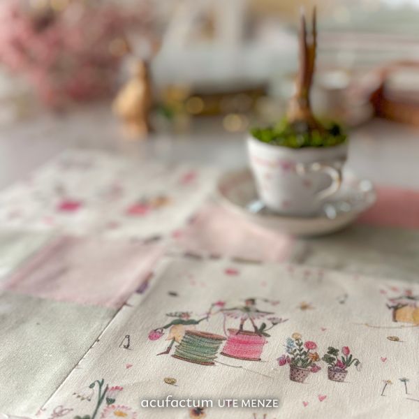 Between the playful scenes, flowers grow from thimbles that serve as small pots. Tailored dolls wear cheerful spring skirts and tell of new ideas that arise in the warm season. In between, butterflies, fine flowers and tiny sewing utensils such as buttons, safety pins and pins dance and create a lively, cheerful overall picture.