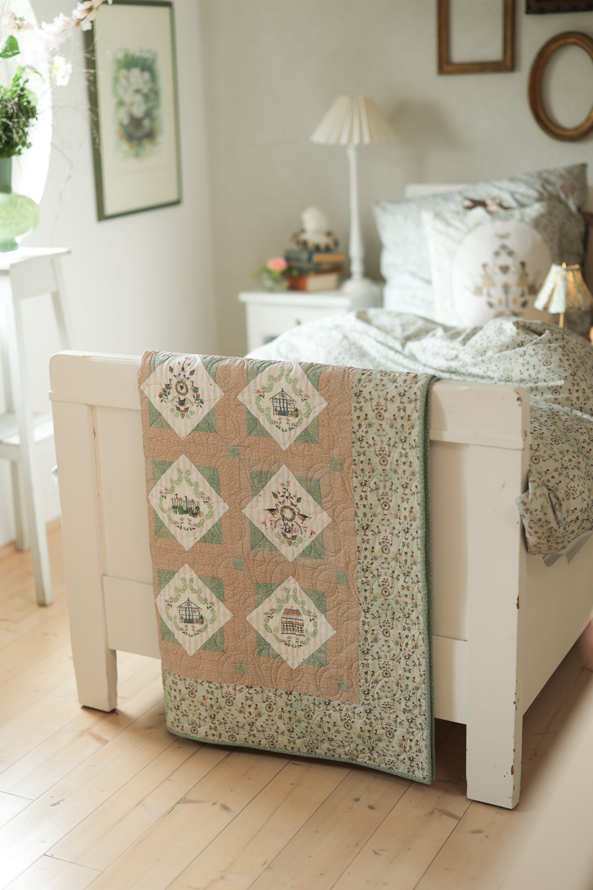 "Like small windows, the quilt’s squares open onto a noble country garden world.