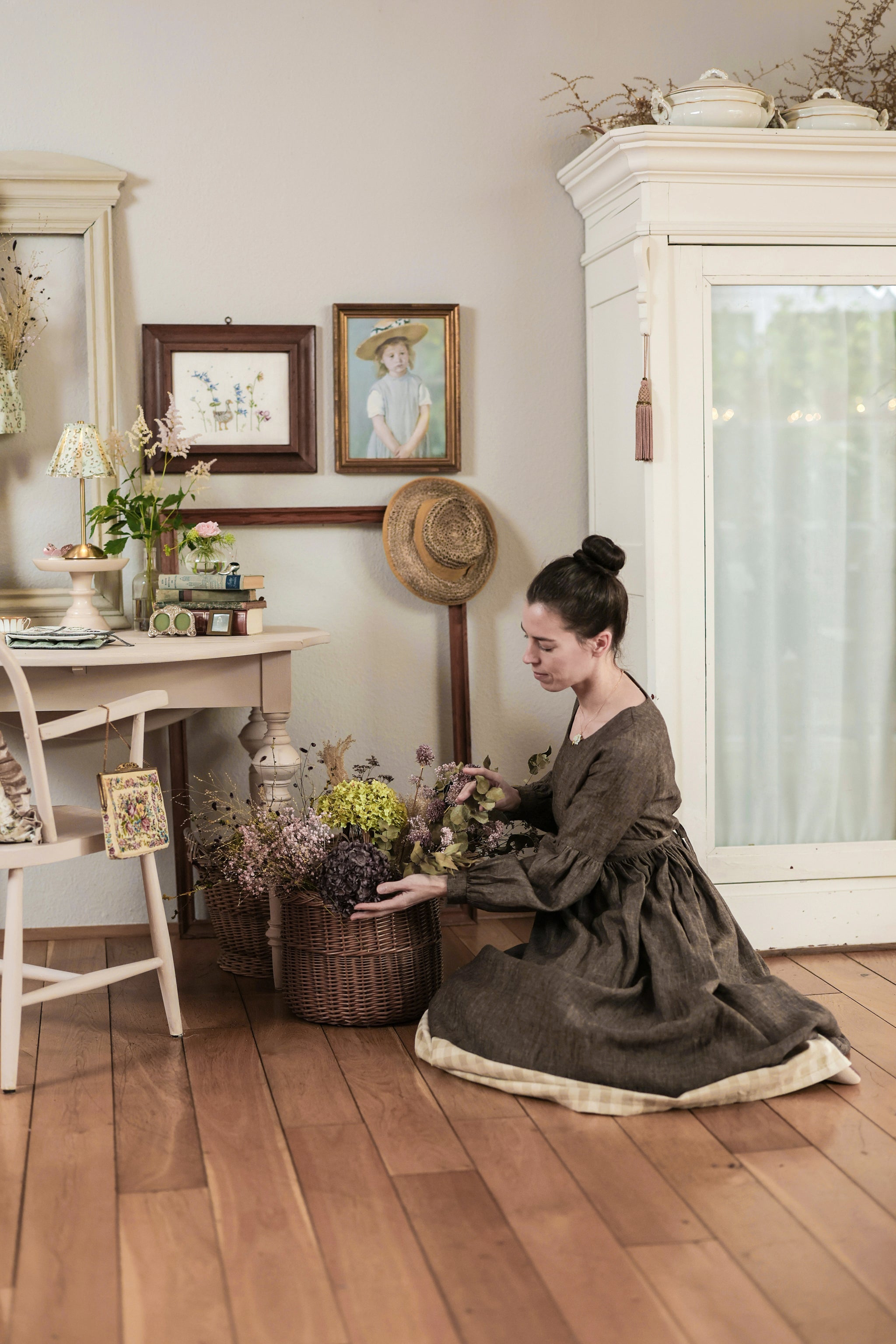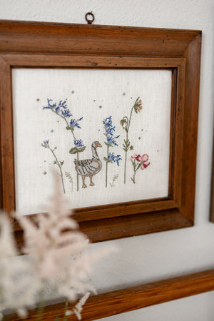This idyllic goose motif was stitched in cross stitch on white evenweave linen and then mounted in an antique picture frame. Together with painted pictures, dried flowers, and old books, it invites you to relax with its nostalgic charm.