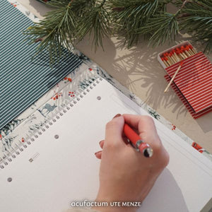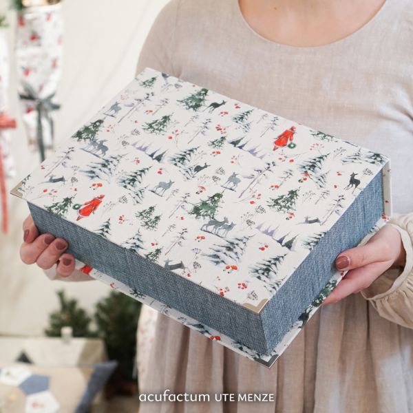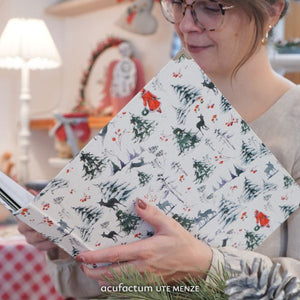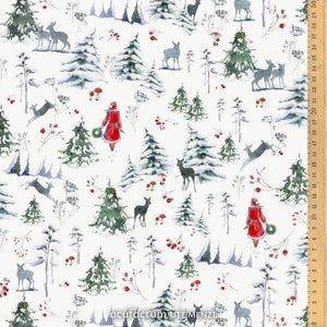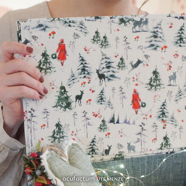 The cotton fabric "Forest Walk" captures the quiet magic of a snowy winter forest. In soft watercolor tones, Sophia Drescher depicts a dreamy scene reminiscent of peaceful walks in nature, when the snow crunches beneath your feet and the world seems to stand still. Between snow-covered firs and delicate plants, you spot a woman in a red coat, wearing a green wreath, walking through the wintry landscape. Delicate deer observe the scene from the shelter of the trees. Small details such as toadstools, rose hips, and frozen grasses add depth and an almost fairytale atmosphere to the design. The soft winter blue background allows the motifs to stand out, creating a calm, atmospheric effect.