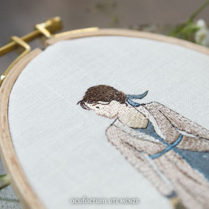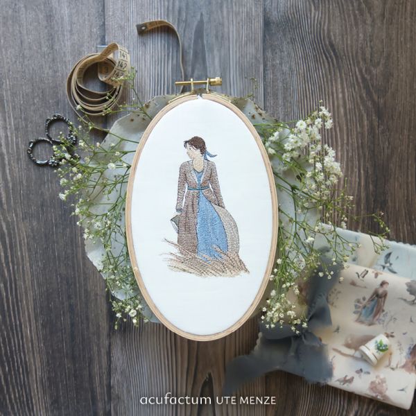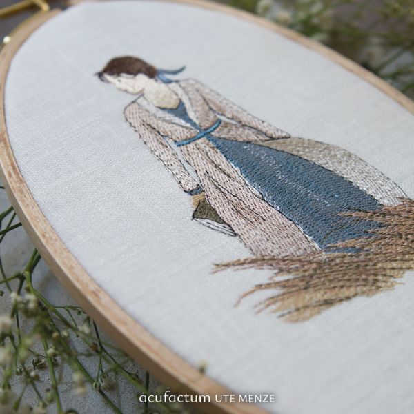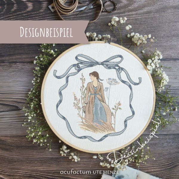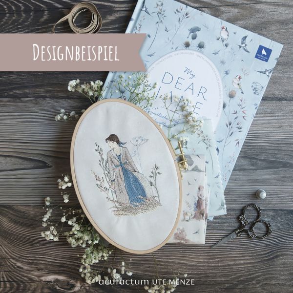 Discover our exclusive embroidery files based on the lovingly drawn motifs from the "My Dear Jane" craft book by illustrator Sophia Drescher. Each motif has been digitally realized with great sensitivity, bringing the book's poetic imagery to fabric. The combination files are ideal for romantic, handmade projects—from delicate decorations to unique clothing. The "Woman with a Book" motif is particularly noteworthy: A young woman stands dreamily amidst tall grass, a book in her hand, her gaze directed into the distance. The motif radiates peace, longing, and a quiet romanticism—perfect for creative sewing ideas with feeling and depth. Inspiration for using these embroidery files can be found in the "My Dear Jane" book, which shows numerous stylish and creative applications. This embroidery motif can be combined and completed with the grasses from the mini set (2-4035-255) and the large rectangular bow frame (2-4035-256).
