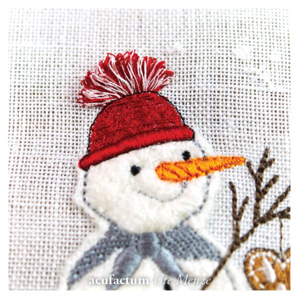 We recommend the white Cotton Soft embroidery stabilizer from Madeira, doubled with 50 g/m². For the wool fabric for the snowmen, we recommend a water-soluble foil, e.g., Madeira Avalon.