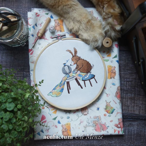 Little bunny eagerly sews his beautiful patchwork quilt. How much he looks forward to his finished result. The motif was created by Sophia Drescher.