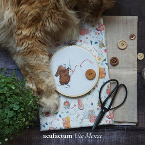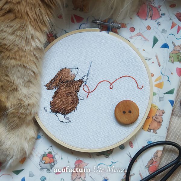 The little bunny proudly shows his sewing needle. He has threaded the thread all by himself! The motif was created by Sophia Drescher.