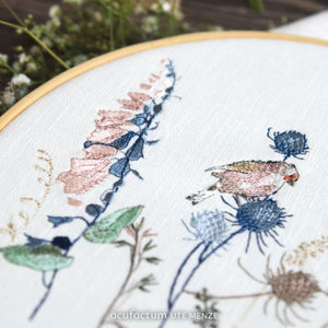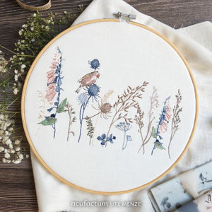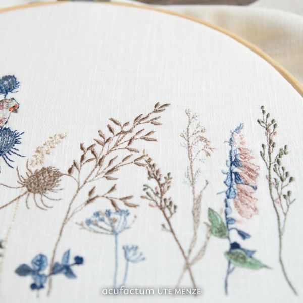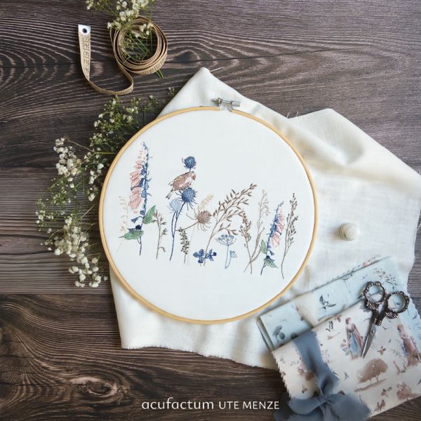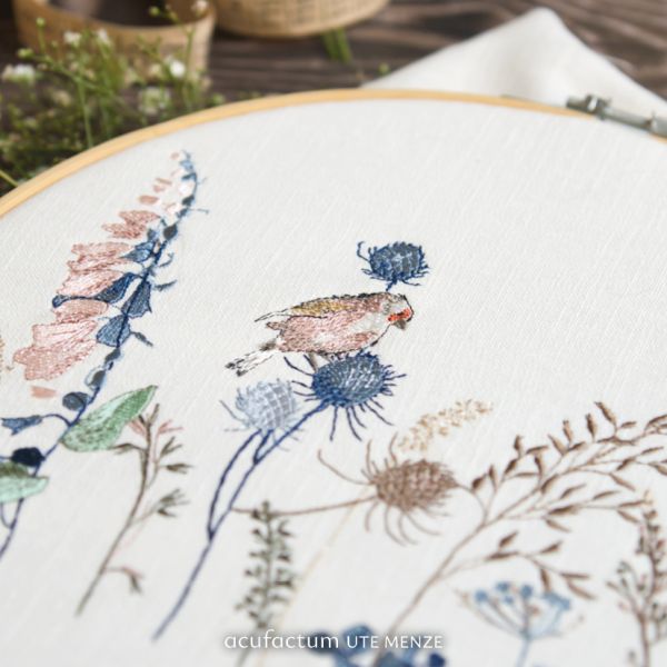 This extraordinary embroidery file is a true highlight of the My Dear Jane series – a poetic composition of delicate grasses, thistles, foxgloves, and goldfinches, artfully combined in a harmonious meadow landscape. Like a symphony of form, color, and natural motifs, this design speaks of lightness, romance, and quiet magic. The color scheme captures the characteristic tones of the My Dear Jane fabric collection, making this file an ideal element for combinable sewing projects. Whether on bags, home textiles, or clothing – this embroidery brings poetry to fabric. Many inspiring examples and design ideas can be found in the My Dear Jane handicraft book, which accompanies the embroidery files like a common thread through lovingly crafted projects – a tribute to the world of Jane Austen, whose romanticism has moved generations.