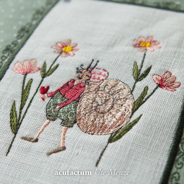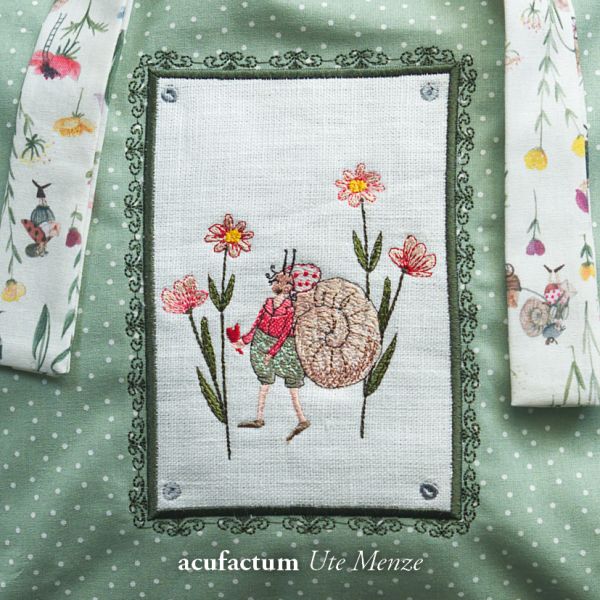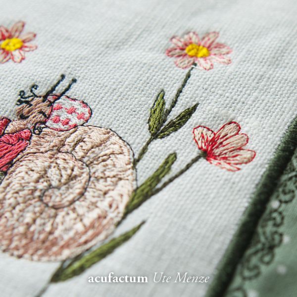 Our little meadow postman has messages of love to deliver. He strides happily through the summery flower meadow and brings love and happiness into the world. The meadow postman wears a particularly delicate snail shell, which the embroidery machine embroiders all by itself with lots of texture and shading. Embroidery motif with picture frame and appliqué work. Detailed instructions for embroidery and appliqué processing, which is carried out exclusively with the embroidery machine during processing, are included with the embroidery file. We recommend backing the appliqué fabric with a light iron-on stabiliser, possibly twice if necessary. The enchanting motif was created by Silke Leffler.