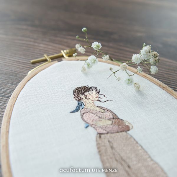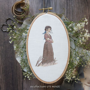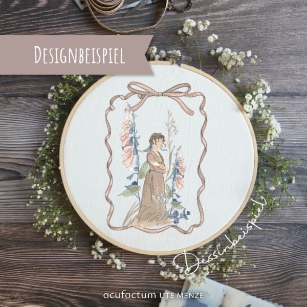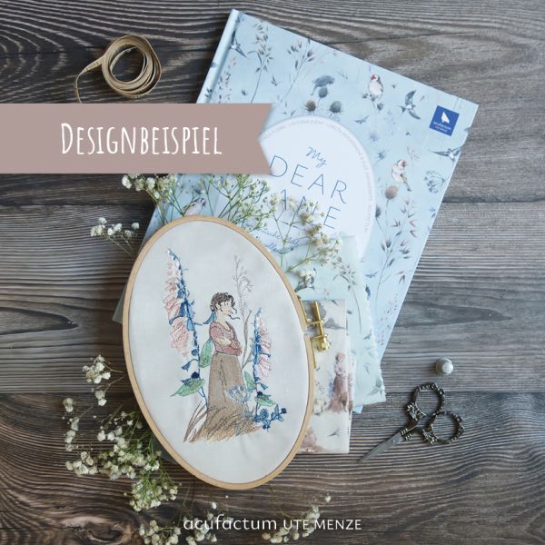 This delicate motif is also part of our embroidery file series for the book "My Dear Jane," inspired by the sensitive illustrations of artist Sophia Drescher. The embroidery file shows a young woman with crossed arms, at peace, standing in the middle of a meadow. Dressed in a natural-colored dress, she gazes calmly and serenely into the distance. The motif captures a quiet moment of mindfulness and inner balance—a wonderful template for tranquil, romantic sewing projects with emotional depth. Like all files in this series, this motif is also a combination file, coordinated with the projects in the "My Dear Jane" craft book. Many inspiring examples can be found both in the book and in the matching fabric collection, which can be harmoniously combined with the embroidery. This embroidery motif can be combined and completed with the grasses from the mini set with thimble (2-4085-254.) and the large round ribbon frame (2-4035-258.).