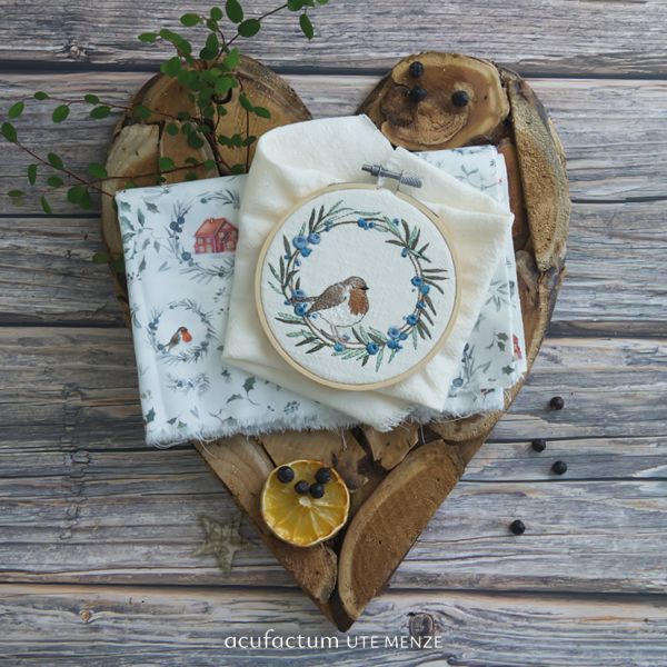 The little robin has settled down in this pretty wreath and is thinking about what to do next. A few more flying exercises or would you rather go back to the warm nest? The motif was created by Sophia Drescher.