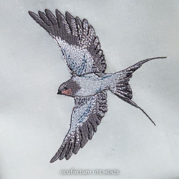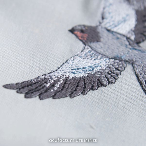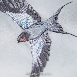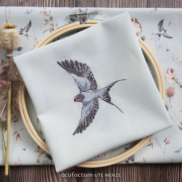 This lovingly designed embroidery file shows a swallow in flight. With its wings wide open, it appears to glide through the fabric, as if carrying a silent message from nature into our hearts. The delicate shades of gray and blue lend the plumage a special depth, while the curved body and elegant forked tail capture its free flight full of grace and vitality. This motif invites you to take a moment of silence and sense the magic of the moment. It is a reminder of how beautiful it can be to let yourself drift and yet find your own path. This embroidery file is perfect for personal sewing projects, whether on cushions, clothing, or small accessories – anywhere you want to feel close to nature and fine craftsmanship. This design is also part of the exclusive embroidery file series for our craft book "My Dear Jane" and can also be found on the fabrics in our collection of the same name. In the book "My Dear Jane," you will find plenty of inspiration for how to stylishly incorporate this delicate motif into your own projects. The motif was designed by Sophia Drescher and implemented and reworked for machine embroidery by Sandra Schruff, www.coradesign.net. It is suitable for embroidery machines only and is NOT suitable for hand embroidery. We recommend the Madeira Cotton Soft white double-layered stabilizer, 50 g/m².