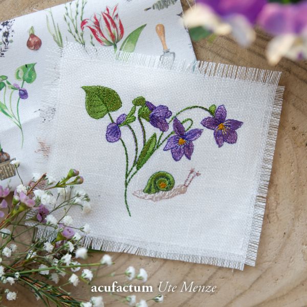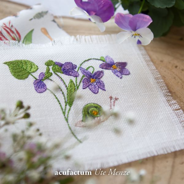 Look forward to finely coordinated colour gradients in the flowers, raised pistils and a charming scroll with textures. The motif was created by Kerstin Heß.