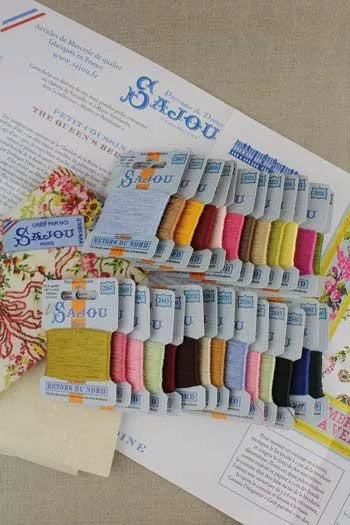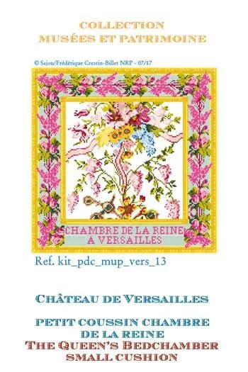 Large cushion to sew in cross stitch inspired by the fabric of the Petit Trianon Queen's Bedchamber. The Petit Trianon was the designated estate of Marie-Antoinette. She created a bucolic setting, full of charm and simplicity. This is an evocation of the fabric in the Queen’s bedchamber: rose bouquets and cornflowers on a white fabric. The original fabric was embroidered by Marie-Olivier Defarges, from Lyon. This marvellous cloth covers the famous “wheat-ear furniture”, created by Georges Jacob: the wood is sculpted and painted with wheat ears braided with honeysuckle and sprigs of jasmin, embellished with lily-of-the-valley and pine cones. After being dispersed during the Revolution, part of this unique furniture has since been acquired by the Palace of Versailles. This chart is taken from our spectacular pattern dedicated to Marie-Antoinette. The two embroideries depicting the Versailles Palace and Marie-Antoinette are the sixth in the “Museums and Heritage” collection. Size of motif: 347 stitches wide by 266 stitches high. When embroidered on 12 count (per cm) linen, the finished project measures 57.8 x 43cm. Size of finished cushion: 57.8 x 43cm. This kit contains: - full-colour pattern chart printed on two 60 x 28cm sheets of paper; - 12 count off-white embroidery linen 70 x 50cm; - 100% cotton fabric 50 x 75cm for the back; - 13 cards of Retors du Nord embroidery floss n°s 2023 x 3, 2033, 2180, 2409 x 2, 2443, 2445 x 2, 2535, 2536; - a Sajou “Créé par moi” label (Made by me). Presented in a lovely Sajou cardboard re-usable box.